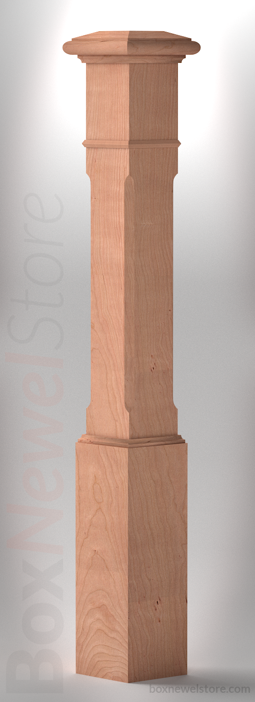 Box Newel Store Classic Cherry Box Newel, SFI Classic Cap with Cove, Chamfor Panels, Pencil Mold Trimband, Loose Basewrap with Cove