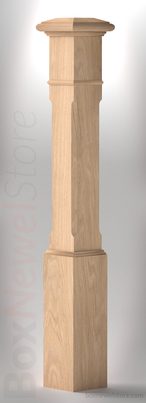 Box Newel Store Classic White Oak Box Newel, SFI Classic Cap with Cove, Chamfor Panels, Pencil Mold Trimband, Loose Basewrap with Cove