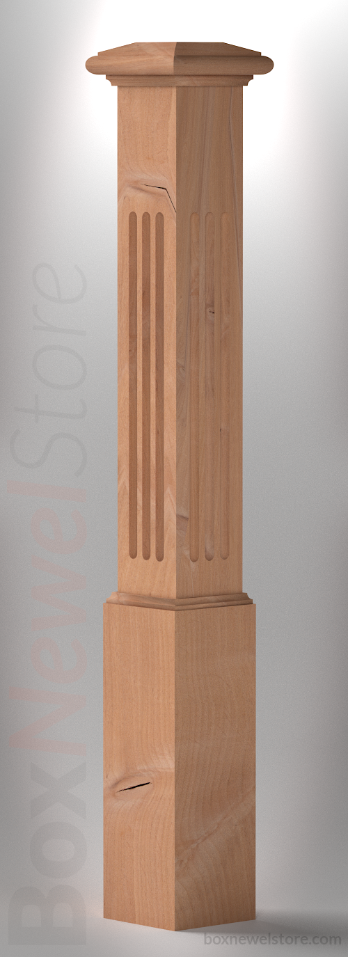Box Newel Store Classic Knotty Alder Box Newel, SFI Classic Cap with Cove, Flute Panels, Loose Basewrap with Cove