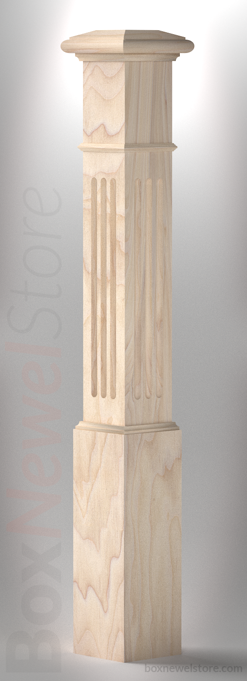 Box Newel Store Classic Poplar Box Newel, SFI Classic Cap with Cove, Flute Panels, Pencil Mold Trimband, Loose Basewrap with Cove