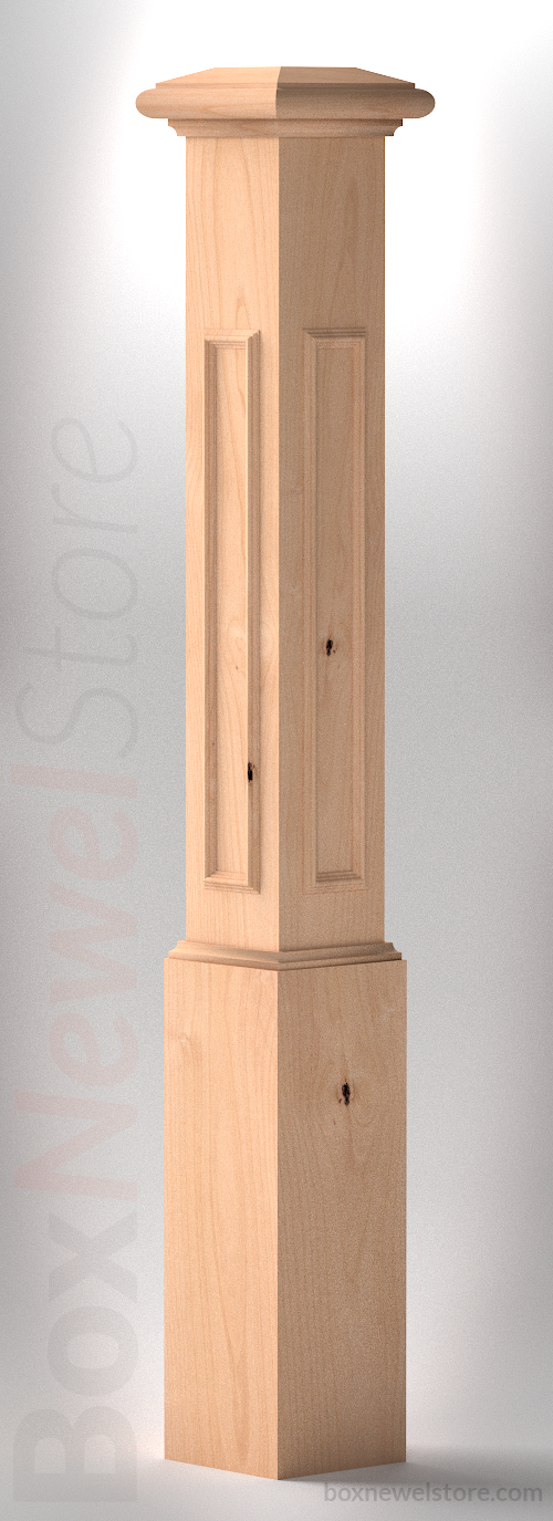 Box Newel Store Classic Clear Alder Box Newel, SFI Classic Cap with Cove, Lower Planton Panels, Loose Basewrap with Cove