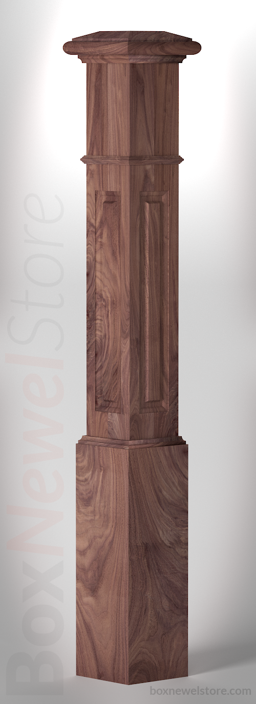Box Newel Store Classic Walnut Box Newel, SFI Classic Cap with Cove, Lower Raised Panels, Pencil Mold Trimband, Loose Basewrap with Cove