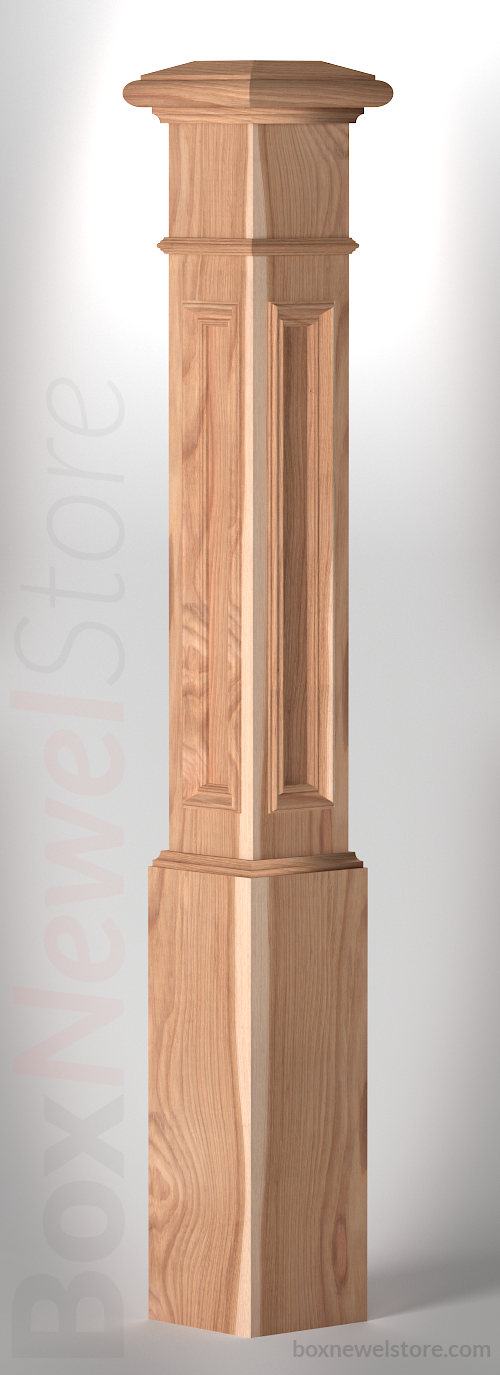 Box Newel Store Classic Hickory Box Newel, SFI Classic Cap with Cove, Lower Recessed Panels with Panel Cap, Pencil Mold Trimband, Loose Basewrap with Cove
