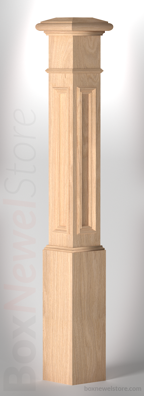 Box Newel Store Classic White Oak Box Newel, SFI Classic Cap with Cove, Lower Recessed Panels with Panel Cap, Pencil Mold Trimband, Loose Basewrap with Cove