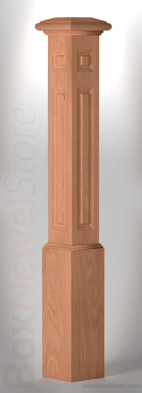 Box Newel Store Classic Red Oak Box Newel, SFI Classic Cap with Cove, Upper-Lower Raised Panels, Loose Basewrap with Cove
