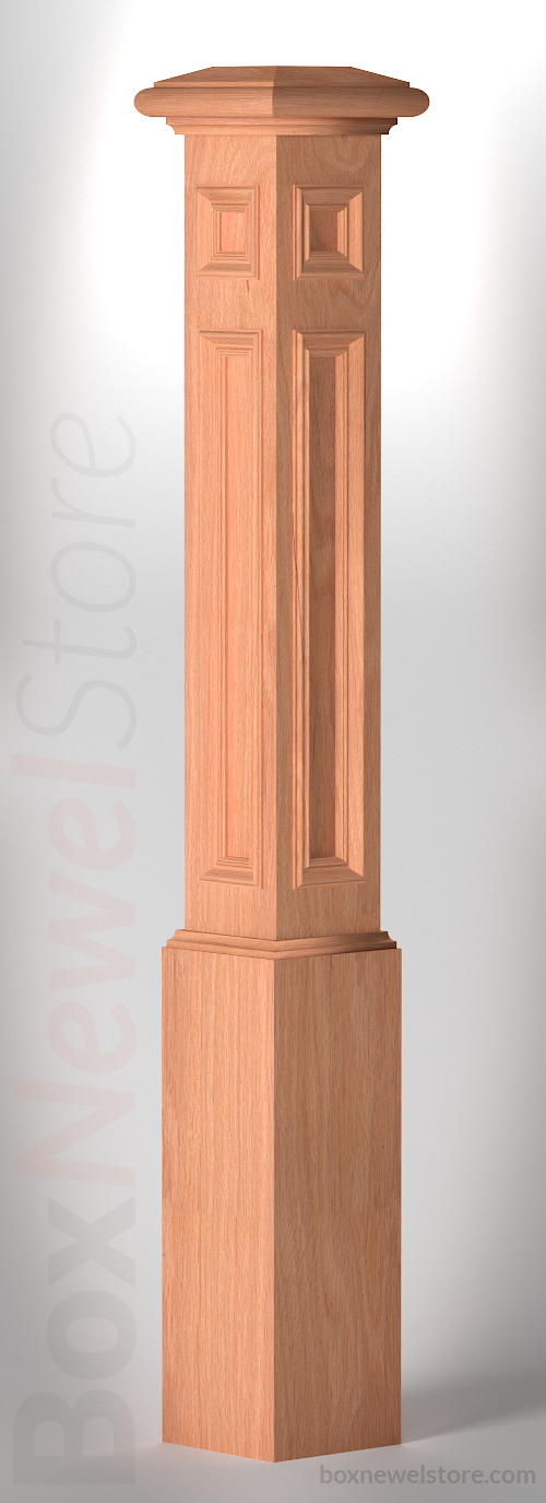 Box Newel Store Classic Red Oak Box Newel, SFI Classic Cap with Cove, Upper-Lower Recessed Panels with Panel Cap, Loose Basewrap with Cove
