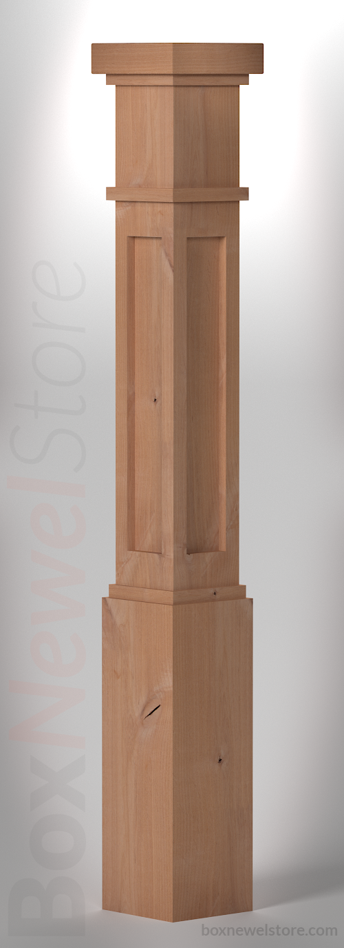 Box Newel Store Craftsman Knotty Alder Box Newel, SFI Craftsman Cap with Square Trim, Craftsman Lower Recessed Panels, Craftsman Trimband, Loose Basewrap with Craftsman Trim