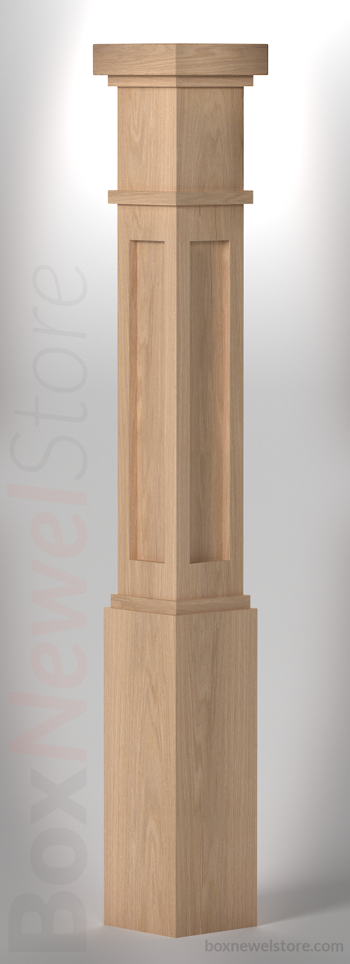 Box Newel Store Craftsman White Oak Box Newel, SFI Craftsman Cap with Square Trim, Craftsman Lower Recessed Panels, Craftsman Trimband, Loose Basewrap with Craftsman Trim