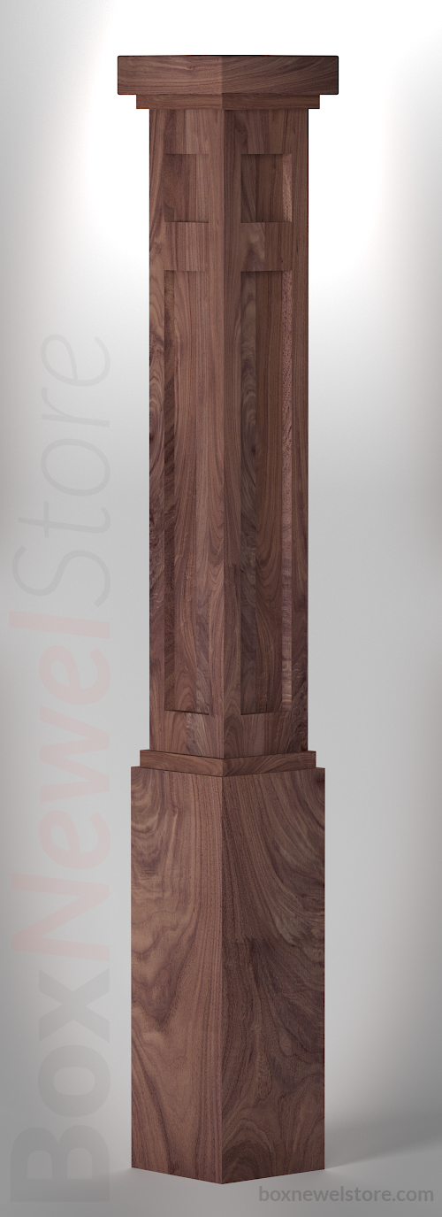 Box Newel Store Craftsman Walnut Box Newel, SFI Craftsman Cap with Square Trim, Craftsman Upper-Lower Recessed Panels, Loose Basewrap with Craftsman Trim
